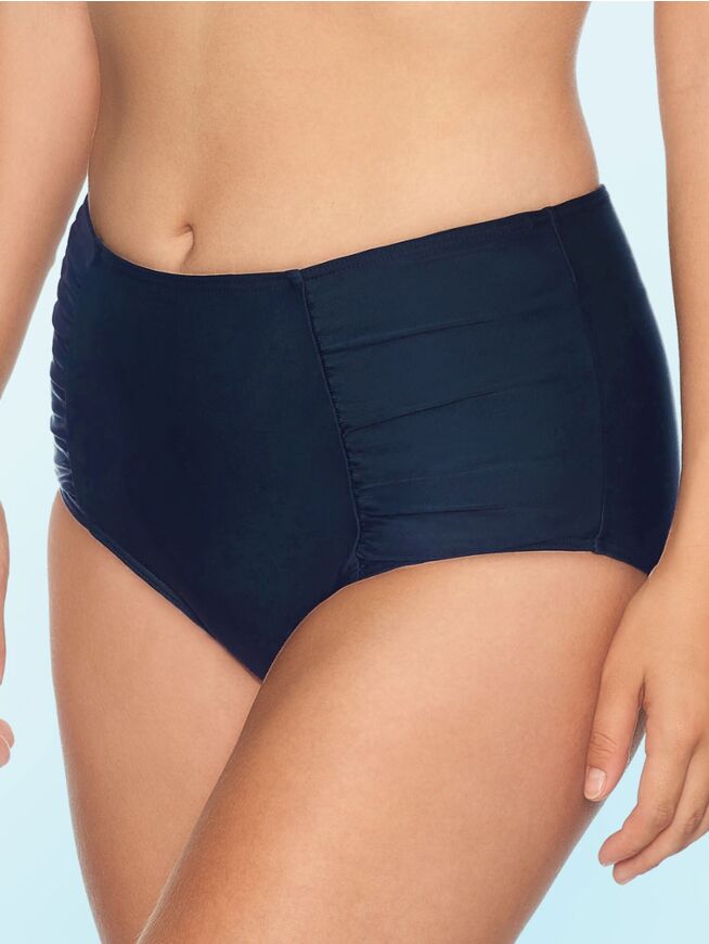 Klassisk bikinitruse med høyt liv og lav skjæring i benåpningen, en kombinasjon som gir god dekkevne. Fine rynkedetaljer på sidene i front gjør den ekstra fin.