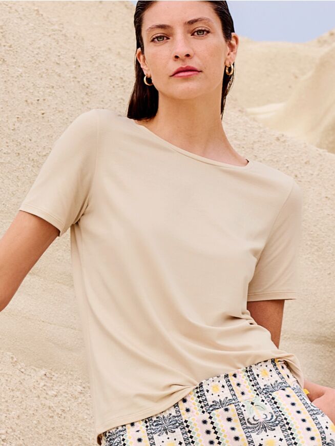 Kortermet skjorte med avrundet hals. Produsert i en høy andel Tencel, Modal som er naturlig pustende, samt gir en ultrafin og silkeaktig følelse mot huden.