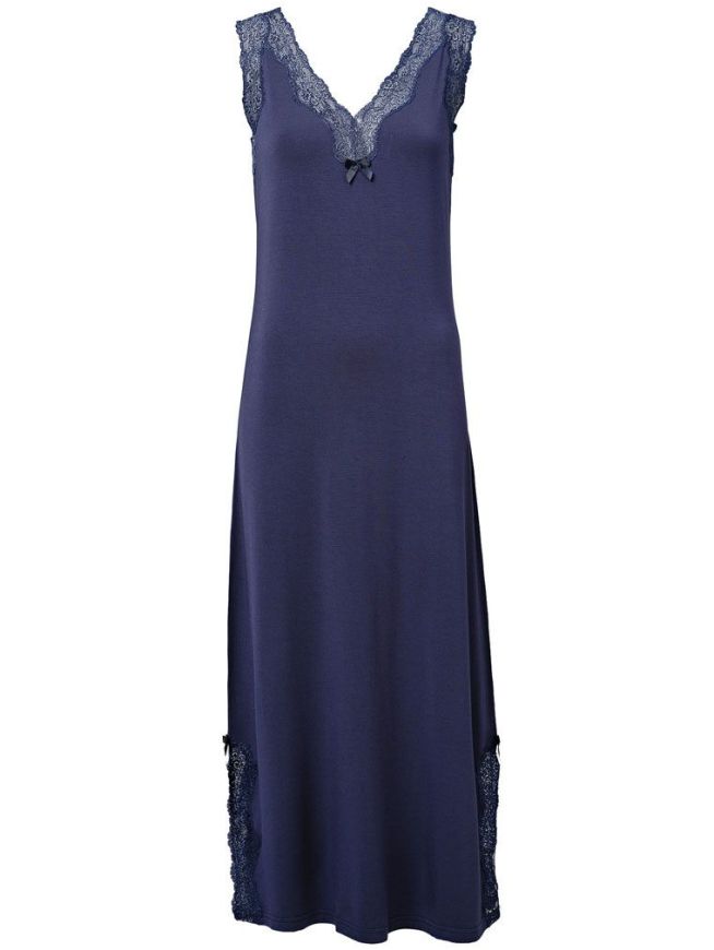 Vakker, lang nattkjole med V-utringning. Myke og elastiske blonder i utringning, både foran og bak. Lekker splitt i sidene.
