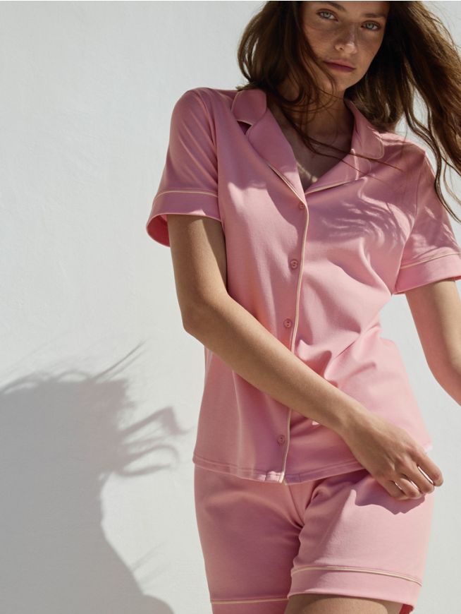 Fint pyjamas-sett med shorts og kortermet skjorte. Produsert i den fineste Tencel, Modal Micro og silke, som er supermyk og ubeskrivelig deilig mot huden.