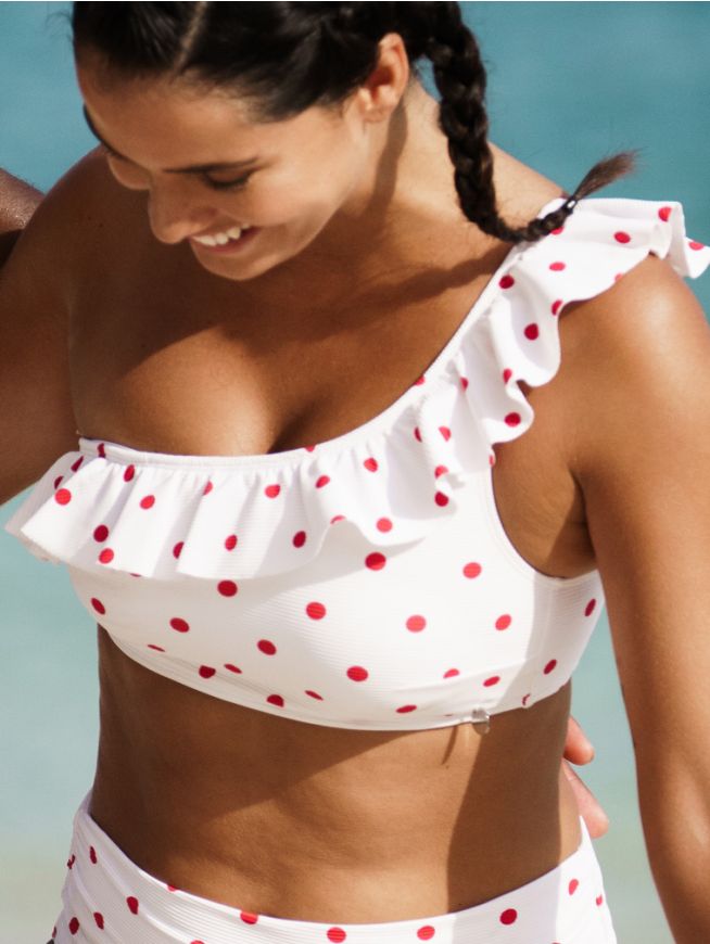 Stilig one-shoulder bikinitopp med rysjer og formede padding som kan tas ut.