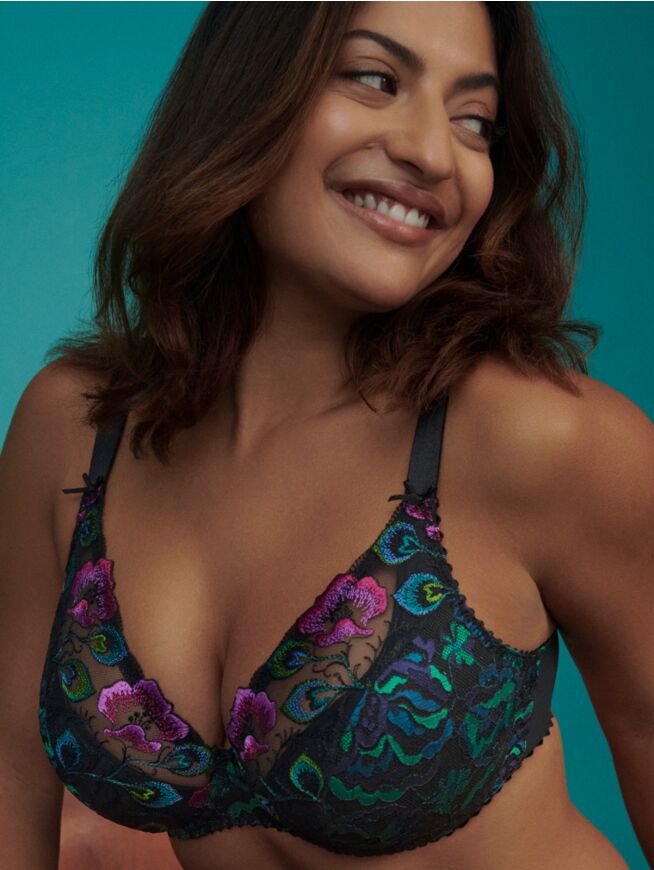 Plunge BH med bøyler som gir utmerket støtte og et godt løft. Nedre del av cup har lett padding/vattering for en avrundet fasong. Dyp skjæring (plunge) gir en sexy utringning. Seriens broderi er overlagt cup’ene og gjør BH’en ekstra fin.