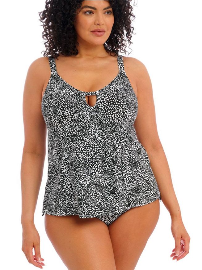 Fin tankini med et kledelig A-symetrisk snitt, som definerer bysten. Kan brukes over bikini BH-er for en tilpasset passform. Elegant stroppedetalj i utringningen pynter opp.