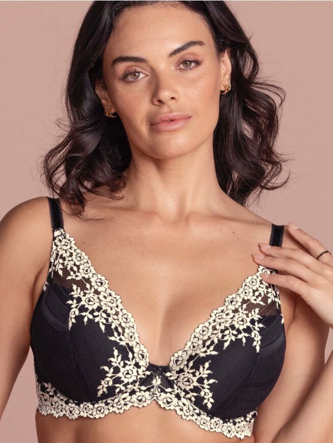 Lekker BH med bøyler og dyp skjæring (plunge), som gir en sexy utringning. 3/4 dels padding i cup som løfter og gir en rund fasong. Stretchye blonder er overlagt cup'ene og sørger for enkel tilpassing.