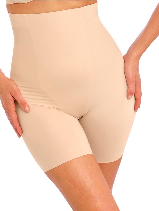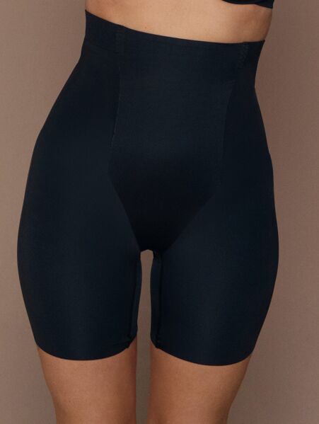Høy shape-truse men lange ben som flater og former magen, takket være et fast-limt frontpanel med mindre stretch. Over frontpanelet er det en brettet og stretchy kant for god komfort (forhindrer også plexus-kompresjon). Linningen rundt resten av trusen har myke, børstede paneler for økt komfort og sikrer at trusen sitter godt. Elastisk midtsøm bak gir definisjon til baksiden.
