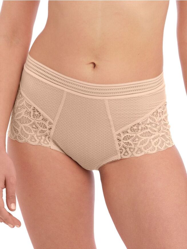 Høy truse med dekorativ lace i front og sømløs finish i benåpningen bak.